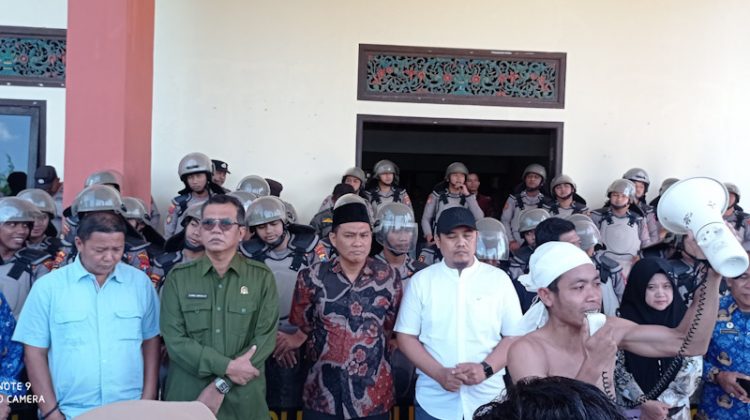 Dari kiri: Ketua DPRD Sumenep (baju hijau) bersama anggota yang lain saat menemui peserta aksi dari BEMSU (Foto/Jejak.co)
