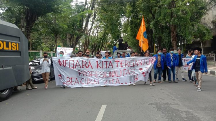 Mahasiswa tetap bertahan meski diguyur hujan hingga akhirnya Kepala Bea Cukai Pamekasan Yanuar menemui massa aksi. Pihaknya berjanji akan menindak para pelaku.