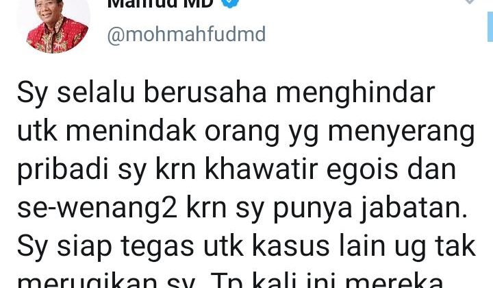 “Saya selalu berusaha menghindar untuk menindak orang yang menyerang pribadi saya, karena kuawatir egois dan sewenang-wenang karena saya punya jabatan. Saya siap tegas untuk kasus lain yang tak merugikan saya, tapi kali ini mereka mengganggu ibu saya bukan bukan mengganggu menko polhukam,” tulis Mahfud dalam akun Twitternya @mohmahfudmd / Mahfud MD.