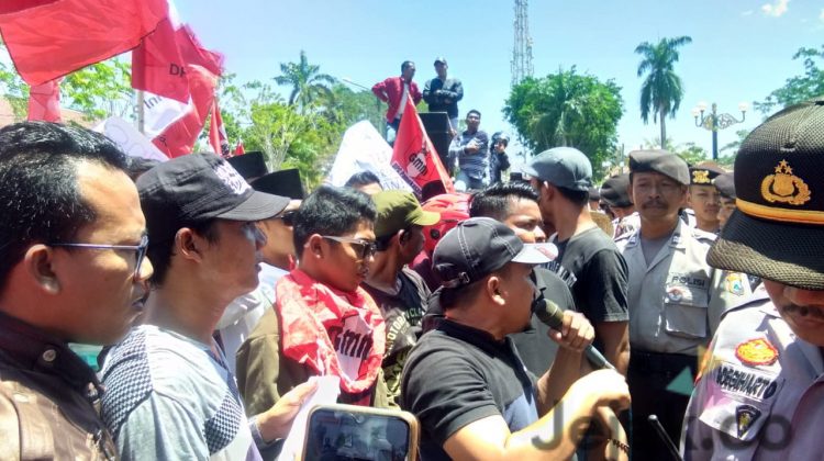 Jejak.co – Puluhan massa di Kabupaten Pamekasan, Madura, Jawa Timur menggelar aksi demonstrasi di depan Rumah Dinas Bupati, Baddrut Tamam menyikapi murahnya harga tembakau, Selasa (9/9/2019).